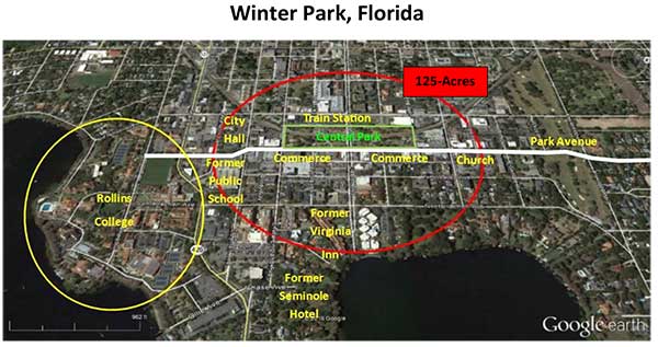 As you can see from the aerial below, the downtown area is very walkable. Park Avenue links many of the community’s key institutions, along with commercial establishments, and its Central Park. Winter Park’s major draw has been its chain of lakes. However, over time its public access has been greatly diminished with the closing of its lakefront hotels, and their replacement with private residences.